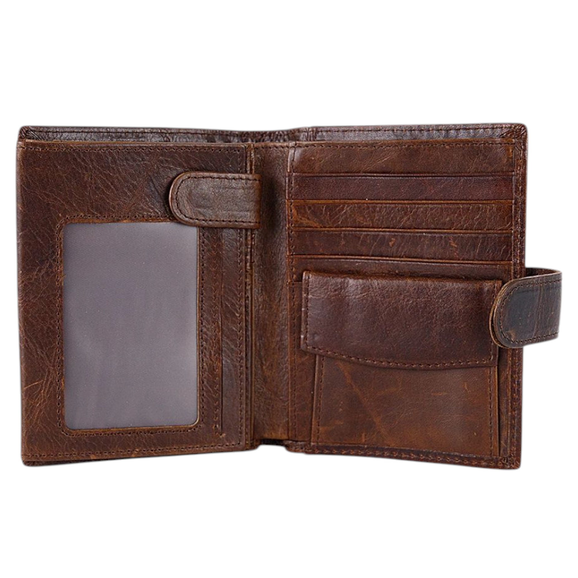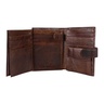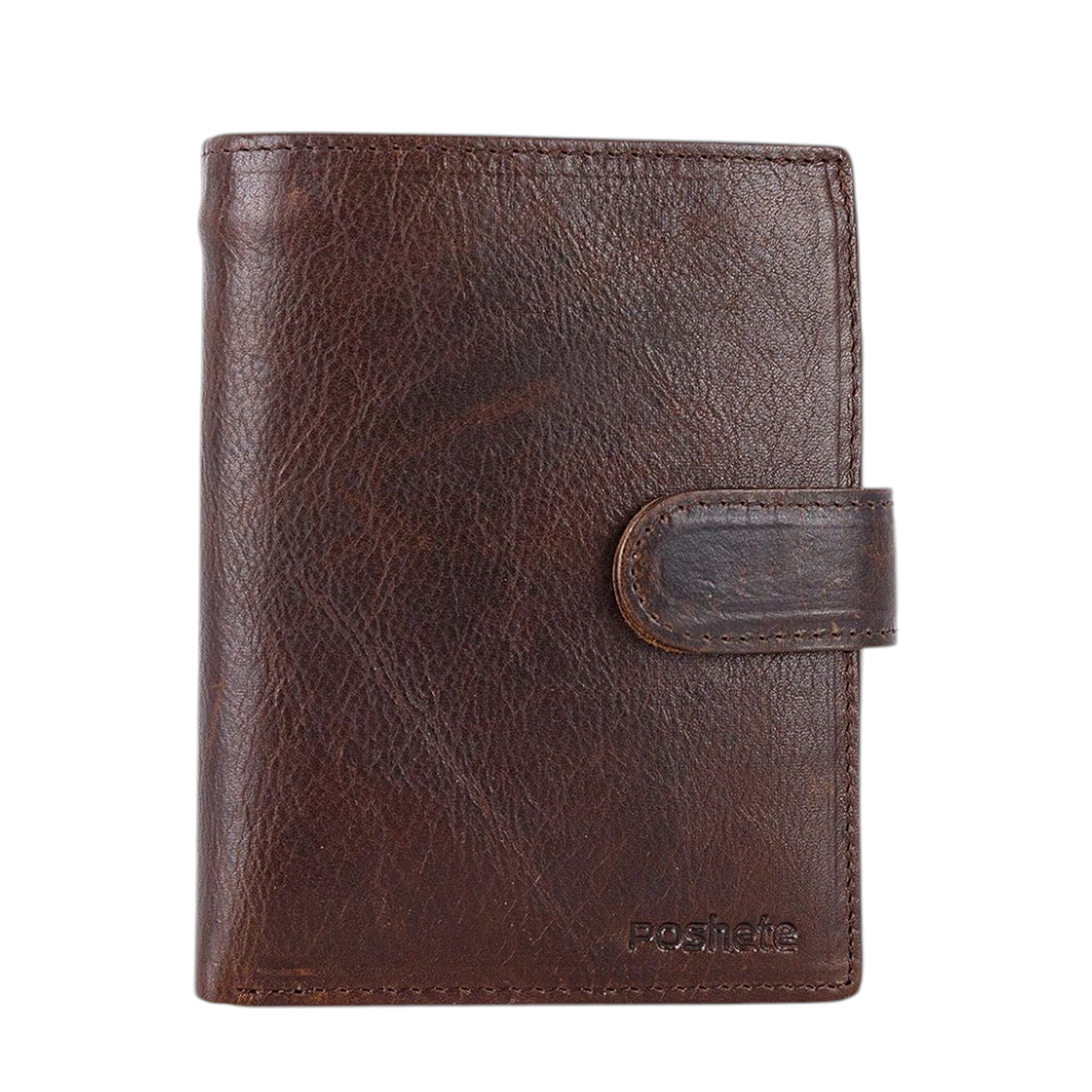 Бумажник от торговой марки Poshete из натуральной кожи коричневого цвета. Закрывается хлястиком на кнопке. Имеет два сложения. Внутри: отделение для купюр и документов, карманы для карт, перегородка, фиксирующаяся хлястиком на кнопку, карман-окошко, карман для монет с клапаном на кнопке.