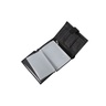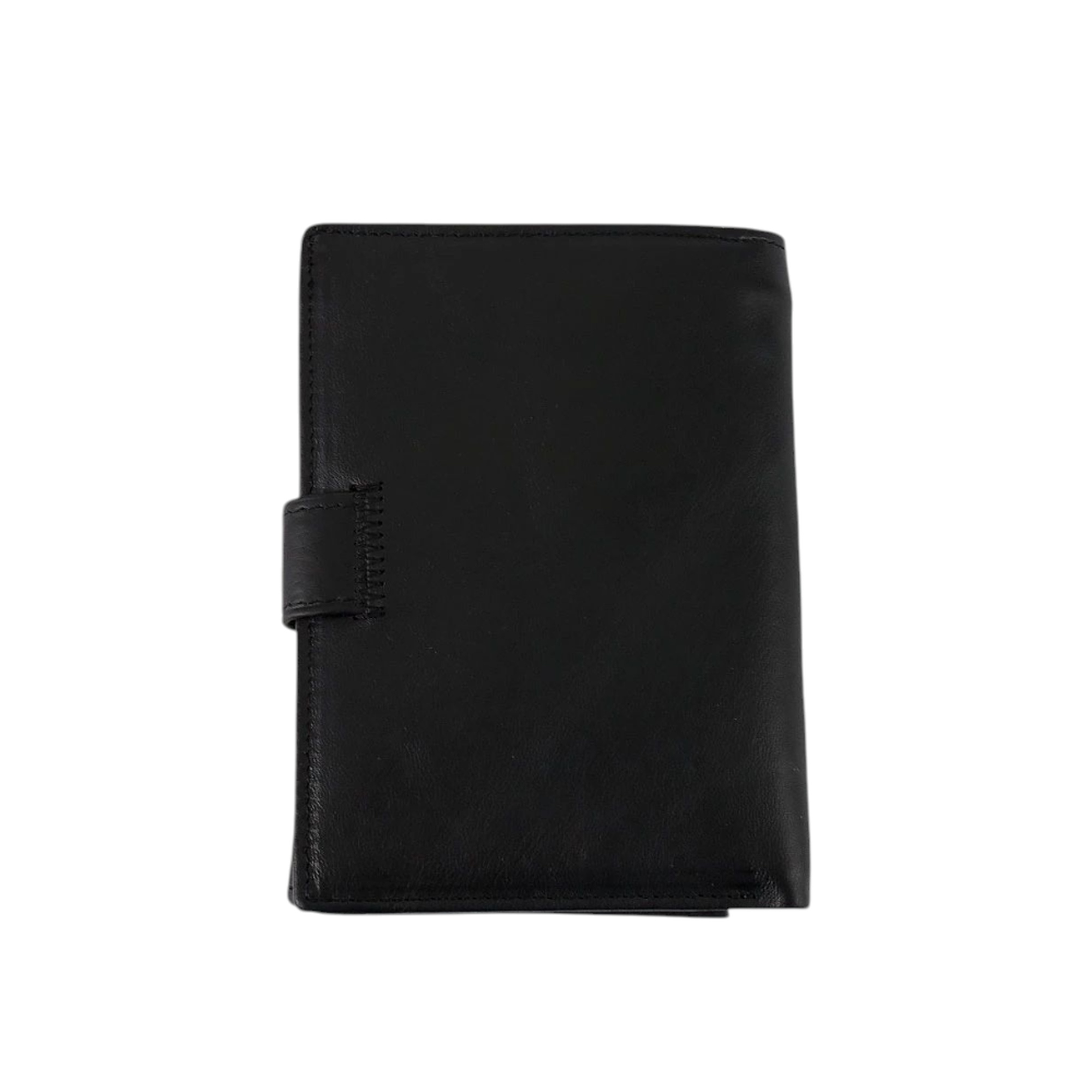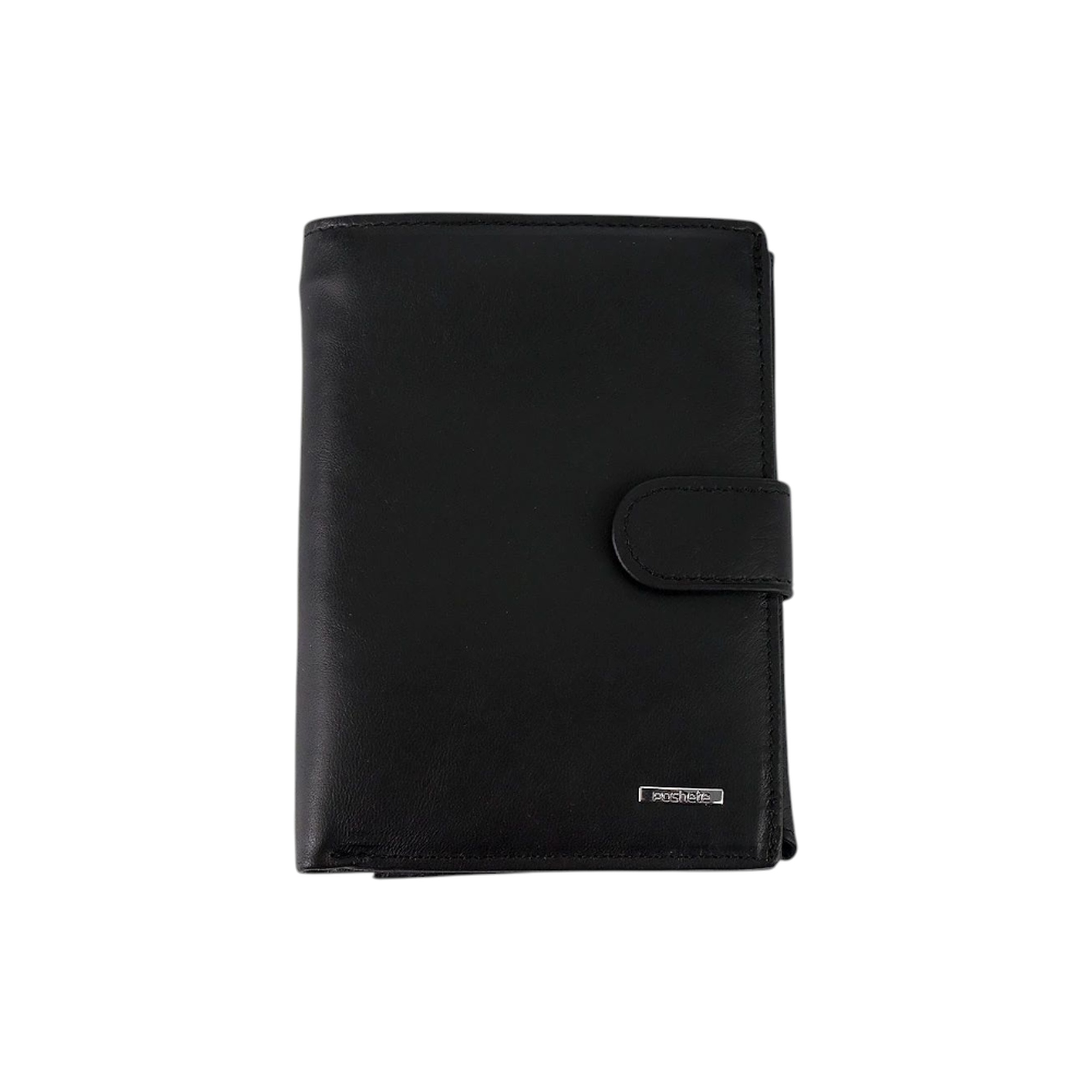 Мужской бумажник Poshete чёрного цвета из натуральной матовой кожи. Внутри отделение для купюр, накладной кармашек для монет на кнопке, кармашки для карточек по двум сторонам и прорезной карман на вертикальной молнии. Левая часть на кнопке, под которой пластиковые кармашки для авто документов. Бумажник книжной формы, закрывается на ремешок с кнопкой.