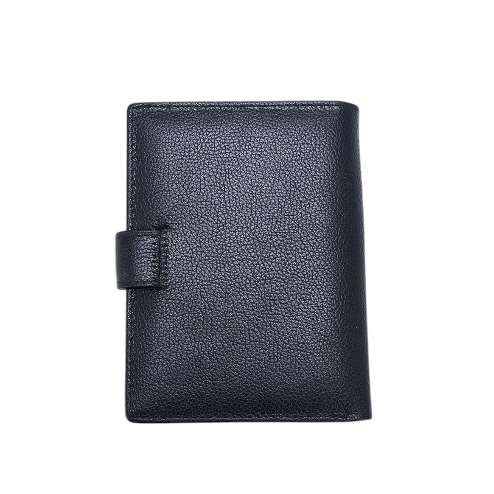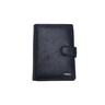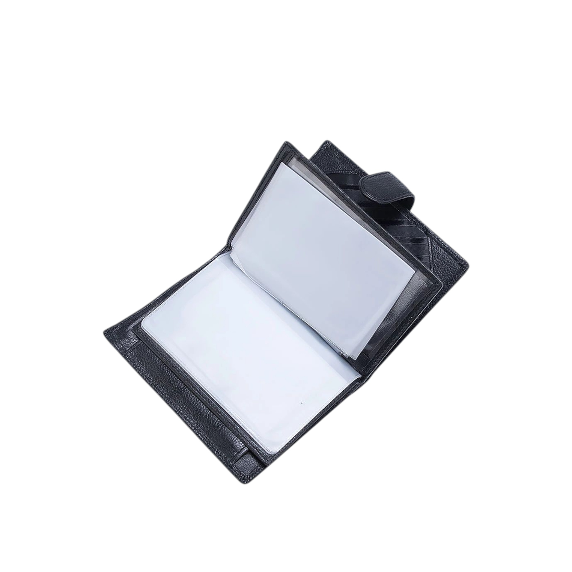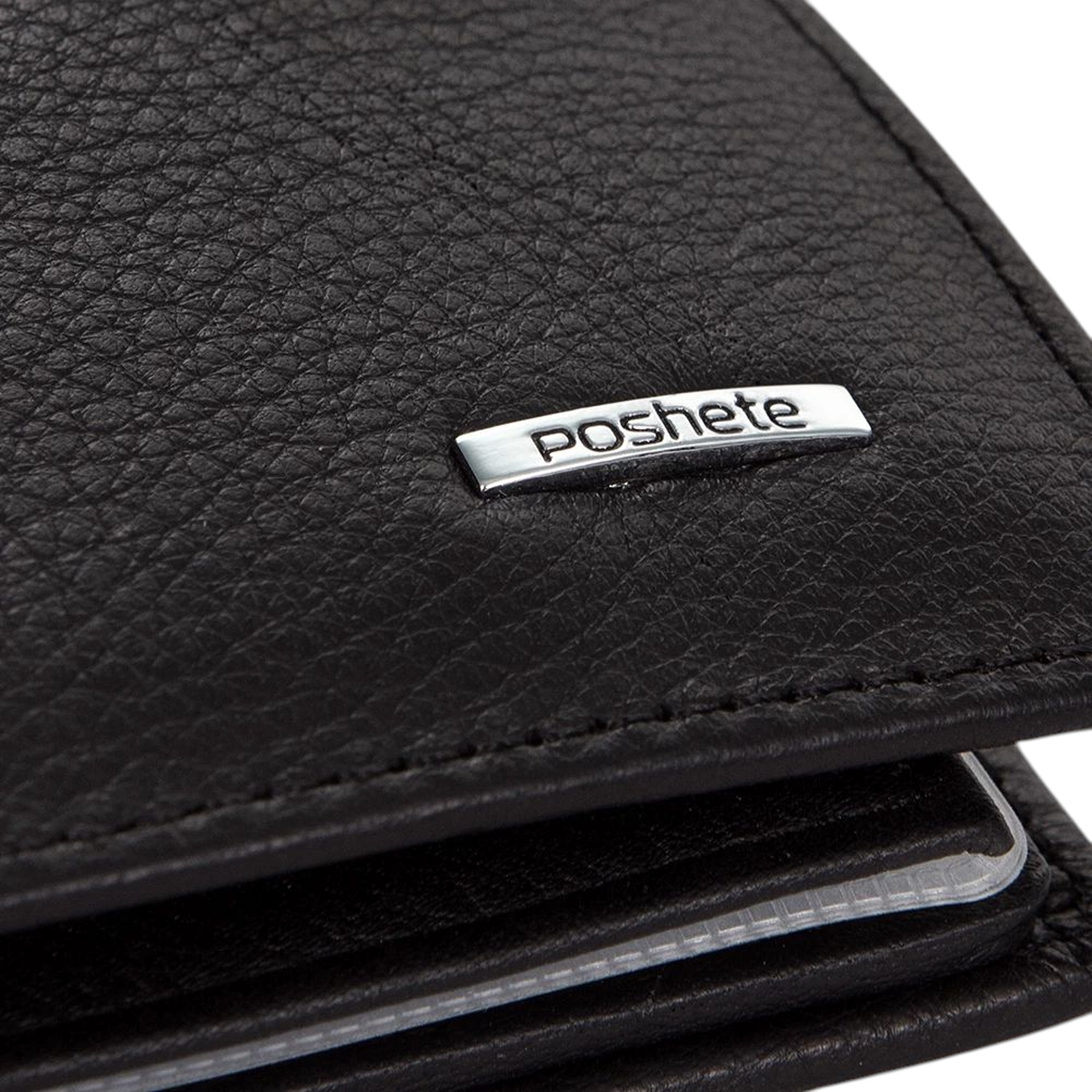 Универсальный бумажник Poshete чёрного цвета из натуральной матовой кожи. Внутри два отделения для купюр, кармашки для сим карт, накладной кармашек для монет на кнопке, кармашки для карточек, отделение для паспорта и пластиковые кармашки для авто документов. Бумажник книжной формы, закрывается на ремешок с кнопкой.