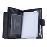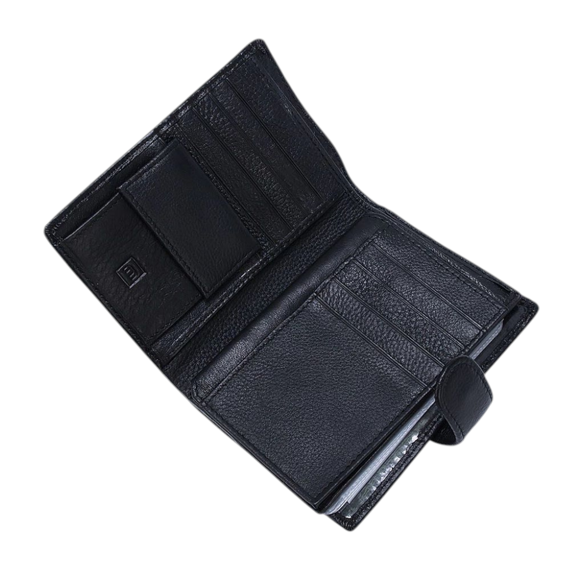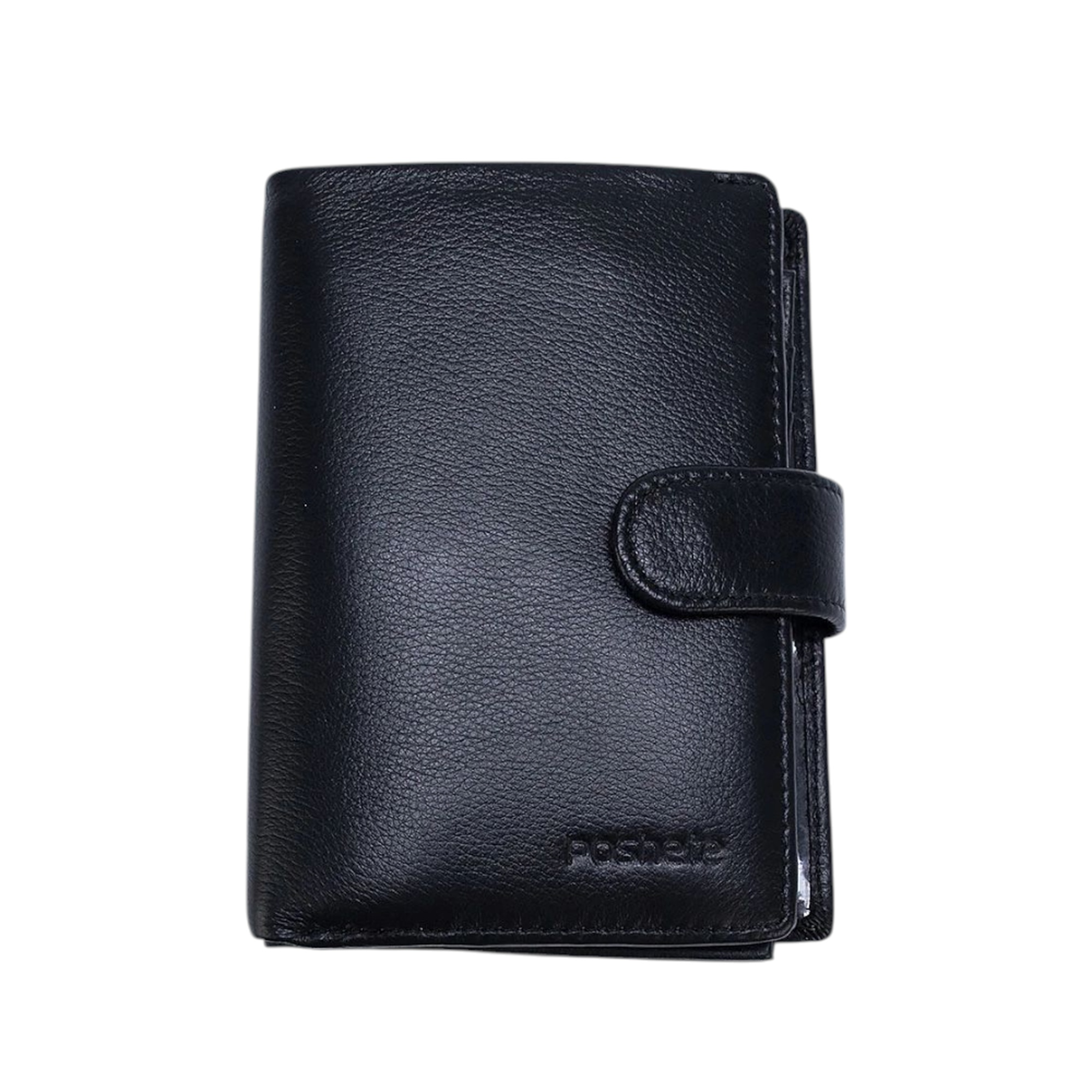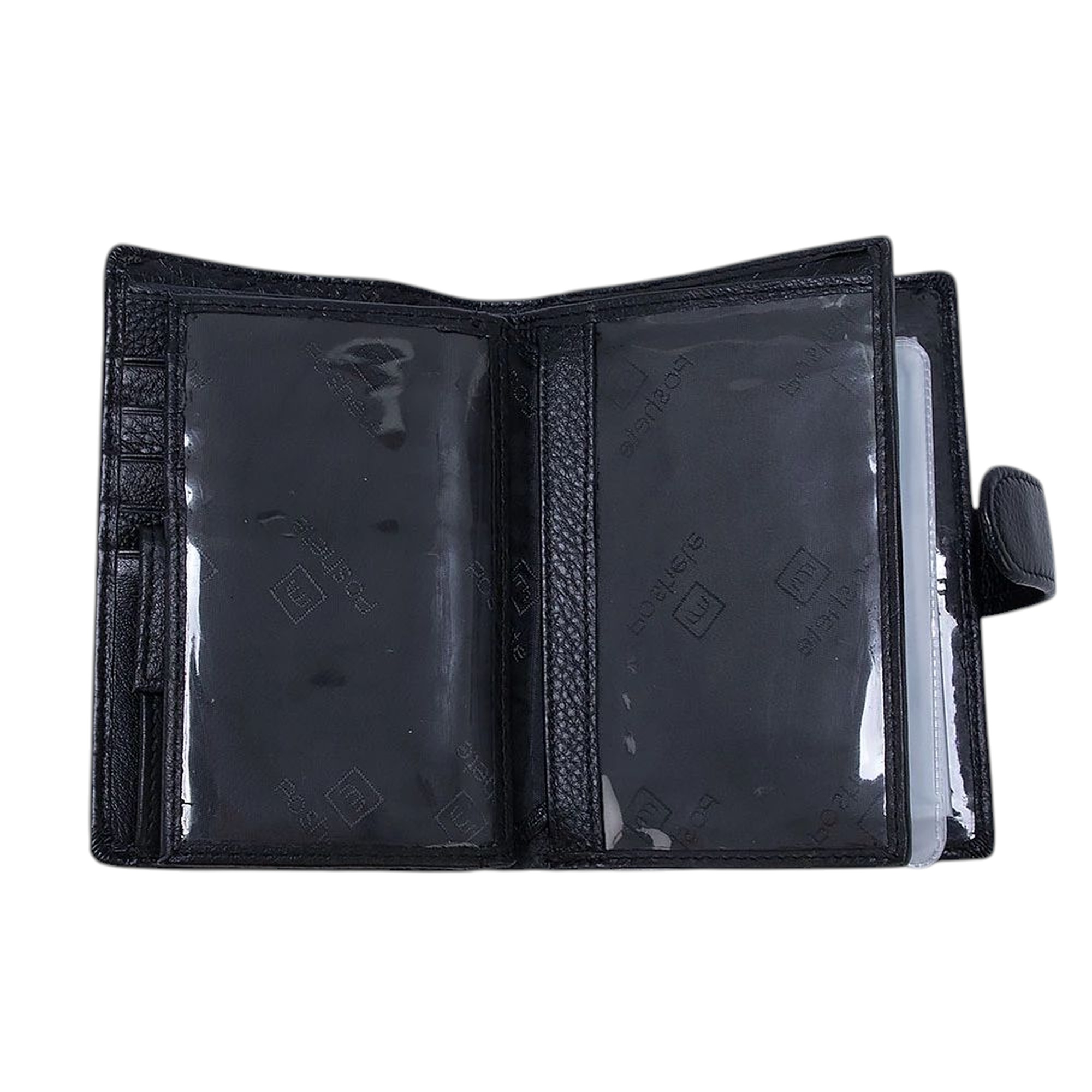 Бумажник Poshete чёрного цвета, выполнен из натуральной матовой кожи. Предусмотрен для денежных купюр, пластиковых карт, авто документов и паспорта. Складывается пополам, фиксируется ремешком на кнопку, раскрывается книжкой, внутри специализированные карманы.