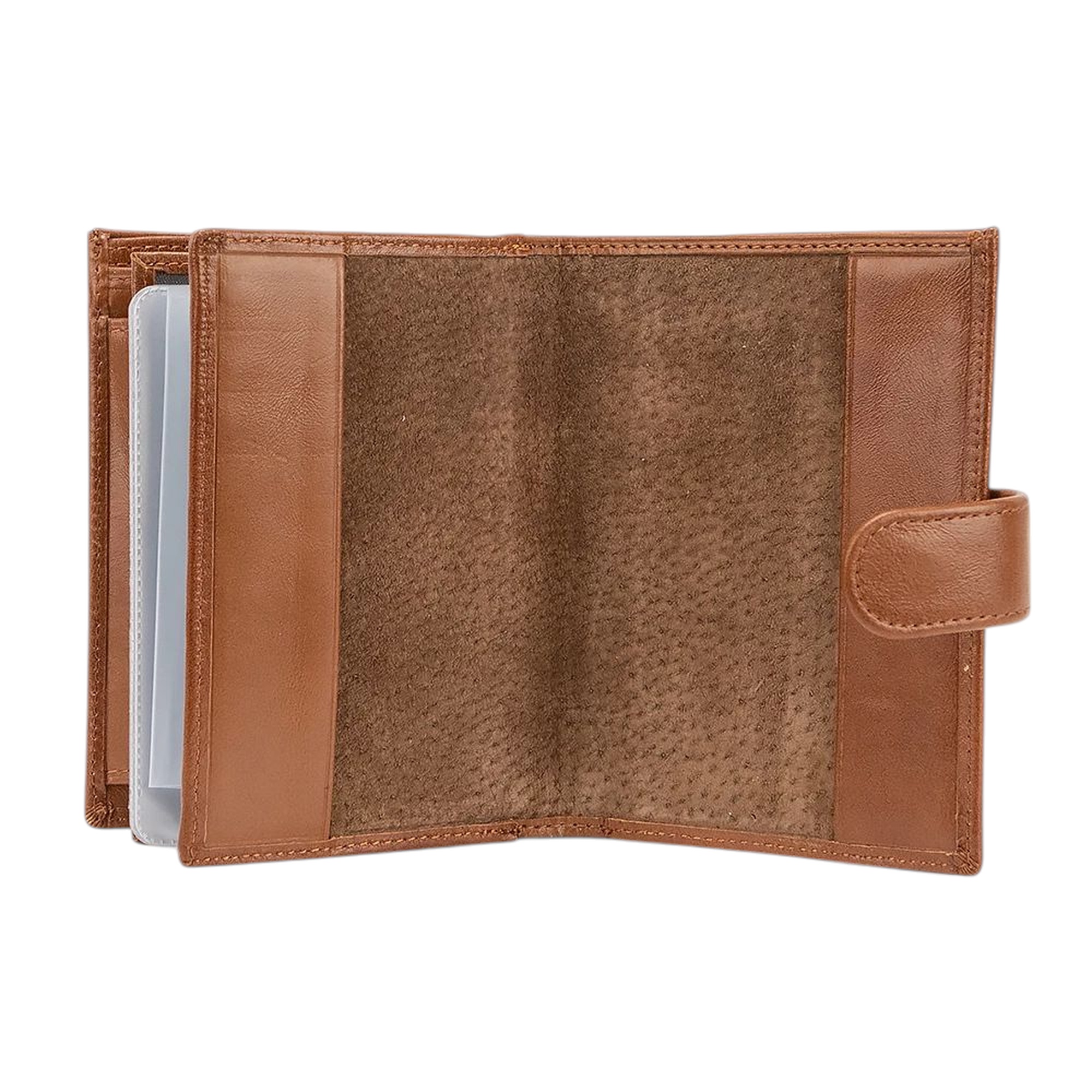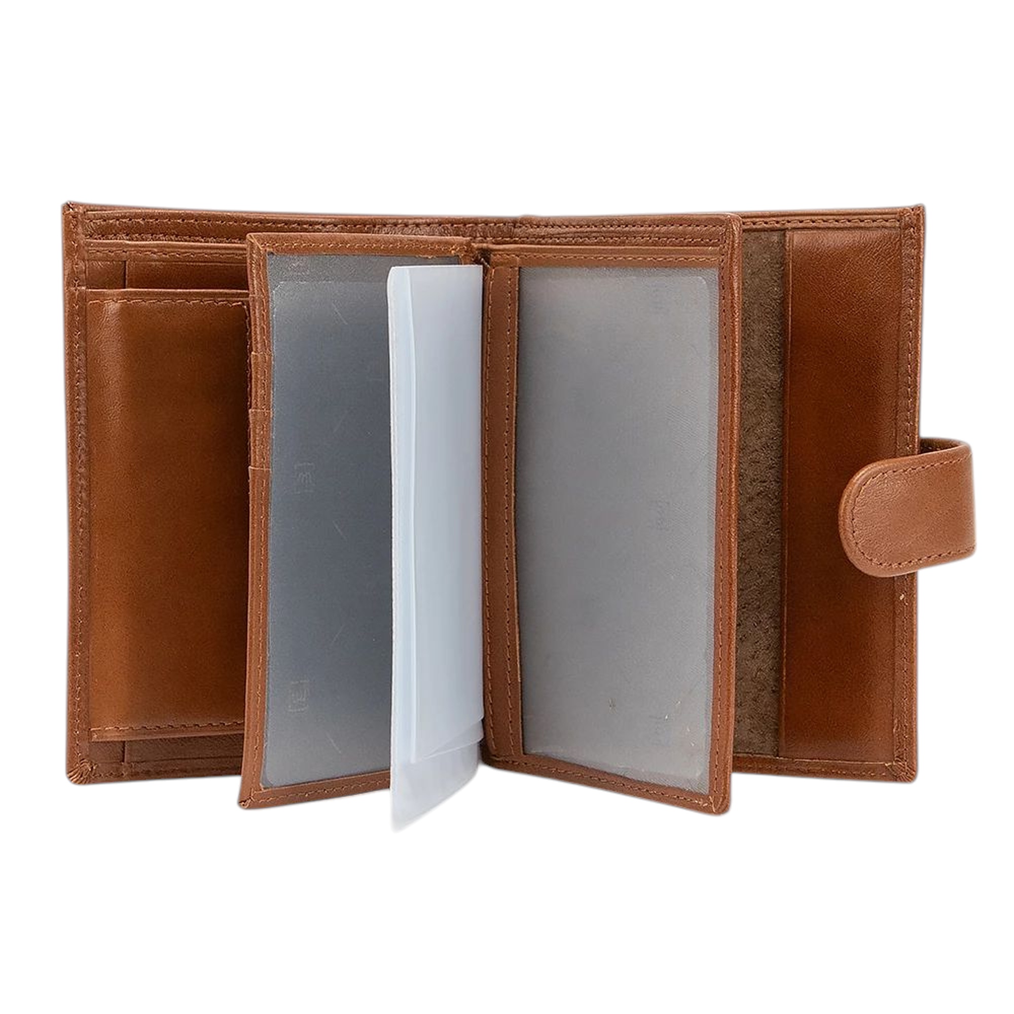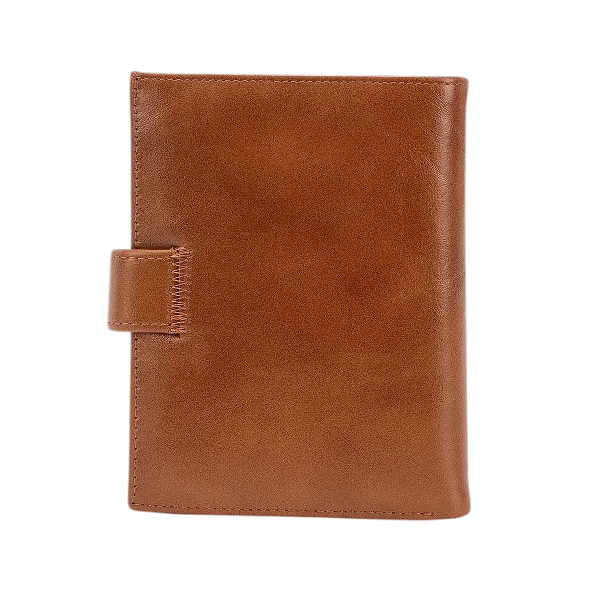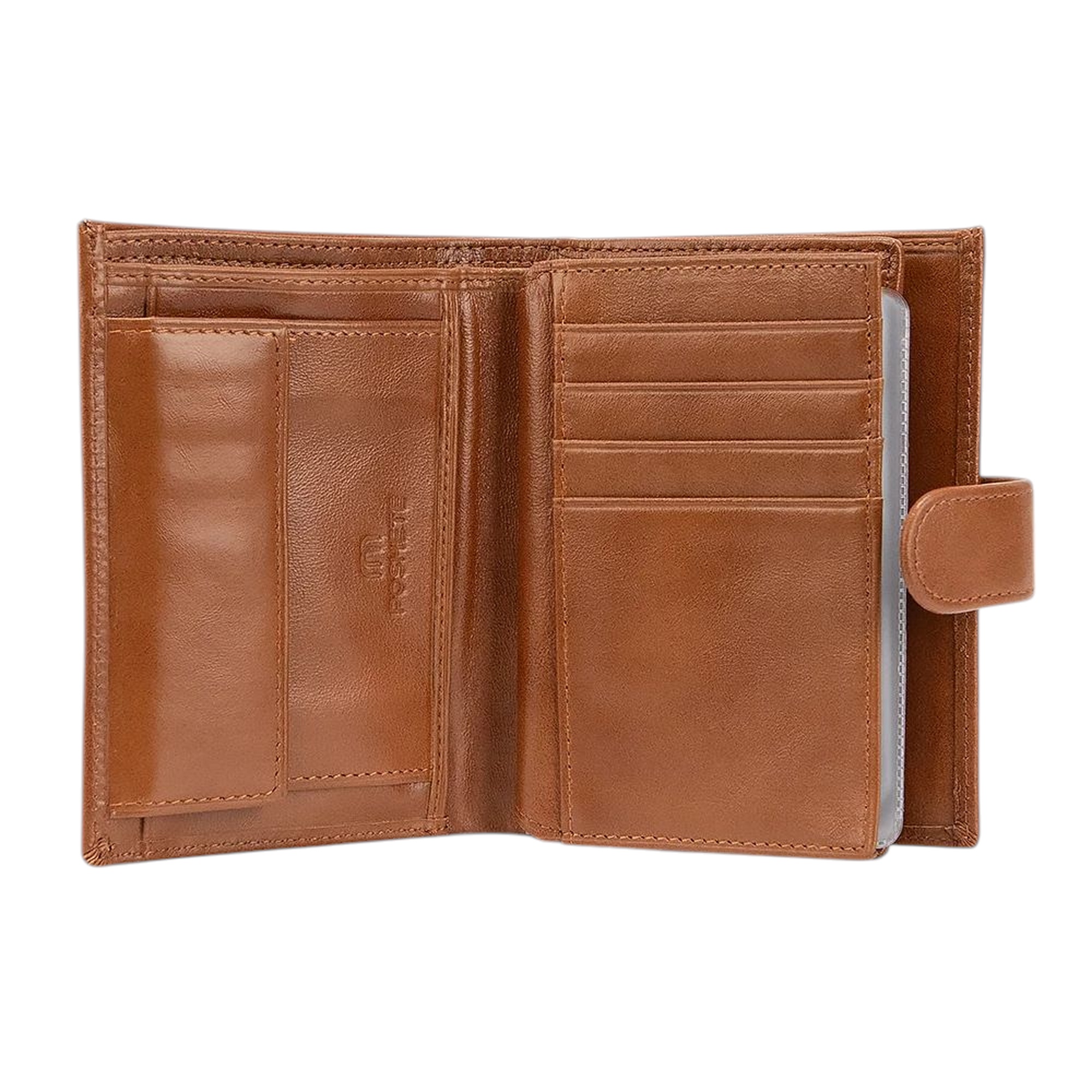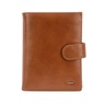 Бумажник от торговой марки Poshete изготовлен из натуральной кожи коричневого цвета. Модель для паспорта и автодокументов закрывается хлястиком на кнопку, раскрывается книжкой. Внутри: три отсека, разделенных перегородкой. В одном – блок-вкладыш из прозрачных файлов для документов водителя разного формата, в другом – два клапана для паспорта. В третьем - карманы для карт. Имеется глубокое отделение для документов.